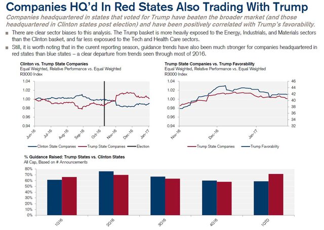 Credit Suisse отмечает, что сразу после выборов рейтинг Трампа вырос, а оптимизм инвесторов в акции был обусловлен акцентом на то, что в ближайшее время могут быть повышены процентные ставки и улучшены перспективы экономического роста за счет налоговой реформы и увеличения расходов на инфраструктуру.