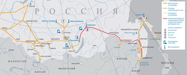 "Газпром" строит газопровод "Сила Сибири", по которому газ с месторождений в Восточной Сибири (Чаяндинского в Якутии и Ковыктинского в Иркутской области) пойдет на российский рынок через Хабаровск до Владивостока, а также в Китай.