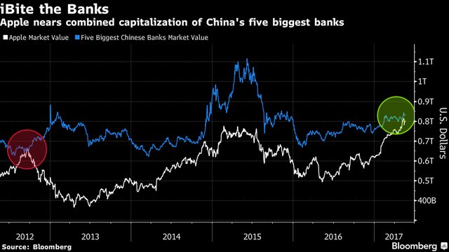Рыночная стоимость Apple близка к суммарной капитализации пяти крупнейших китайских банков - Industrial and Commercial Bank of China Ltd., Bank of Communications, China Construction Bank., Agricultural Bank of China Ltd. и старейший китайский банк Bank of China Ltd. Каждый из них находится в числе крупнейших мировых банков, сообщает Bloomberg.