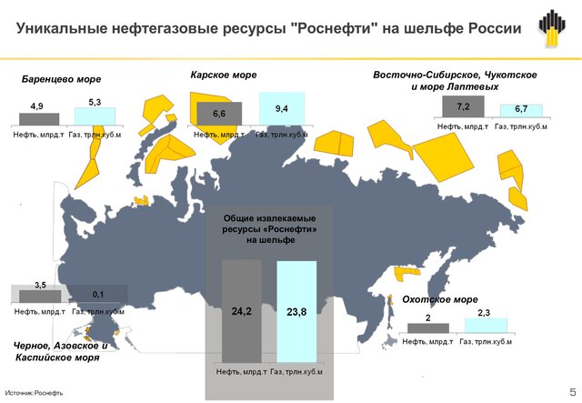 "Роснефть" имеет 28 лицензионных участков на арктическом шельфе, совокупные ресурсы участков оценивают в 34 млрд тонн нефтяного эквивалента. "Роснефти" принадлежат 78% общей площади лицензионных участков в Арктике. К 2050 г. на арктическом шельфе будут добывать 20-30% российской нефти.