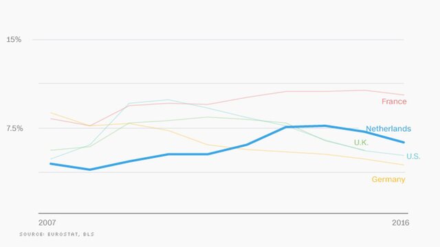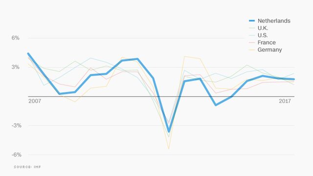 Премьер-министр страны Марк Рютте, который баллотируется на второй срок, приоритетным направлением своей кампании сделал сильную экономику страны. В 2016 году рост в стране составил 2,1%, по предварительным данным агентства Eurostat.