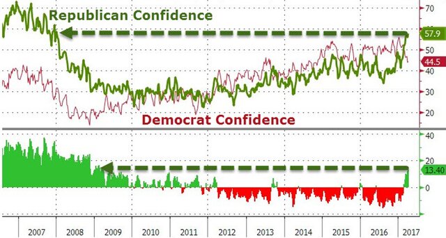 С января 2008 г. республиканцы чувствовали себя не так комфортно, как в месяцы после выборов. Демократы же наоборот показывают снижение потребительского комфорта до минимума с декабря 2015 г.
