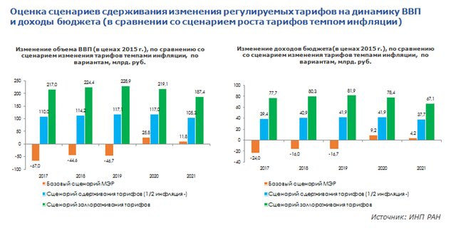 Замминистра экономического развития Николай Подгузов приводил следующие цифры: с 2000 по 2016 гг. цены на газ увеличились в 15 раз, на железнодорожные перевозки — в 10 раз, на водо- и теплоснабжение — в 28 раз, а промышленные цены — только в шесть. При этом рост тарифов госмонополий не привел и к обновлению инфраструктуры: доля оборудования за пределами нормативных сроков службы достигла 45-50%.