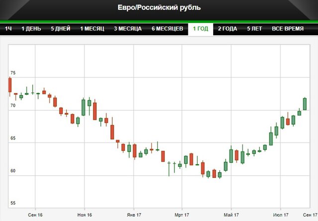 Курс евро в ходе торгов на Московской бирже вырос на 1,04% по отношению к рублю и достиг 72,007 руб. Единая европейская валюта превысила отметку в 72 руб. впервые с 26 сентября 2016 года.Между тем, курс доллара повысился на 0,33% - до 60,55 руб., свидетельствуют данные торгов.