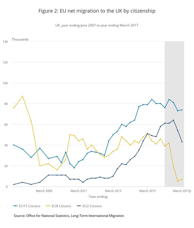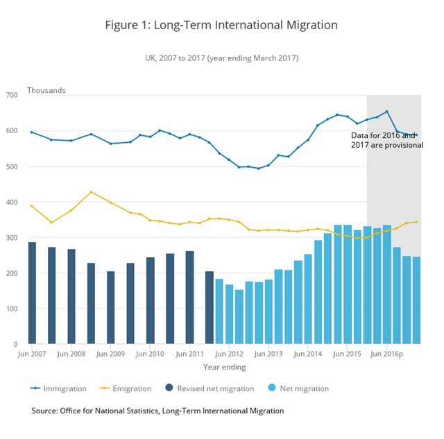 "Чистая миграция в период за год до марта 2017 г. составила 246 тыс. человек, что стало снижением на 81 тыс. человек по сравнению с предыдущим годом. Две трети от этого числа пришлись на чистую миграцию из стран ЕС. Изменения показателя чистой миграции было вызвано увеличением эмиграции, в основном граждан ЕС, а также снижением иммиграции по всем группам.