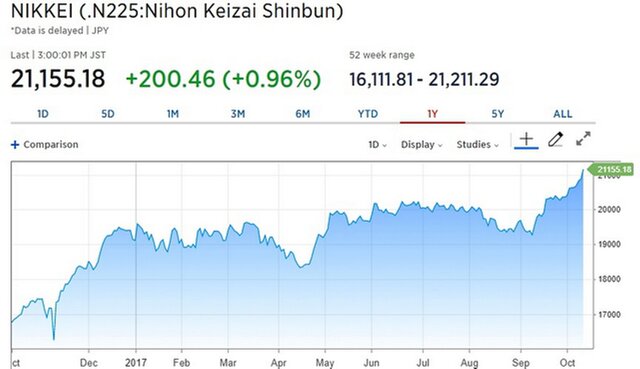 Японский Nikkei 225 прибавил 0,9%, достигнув 21-летнего максимума.