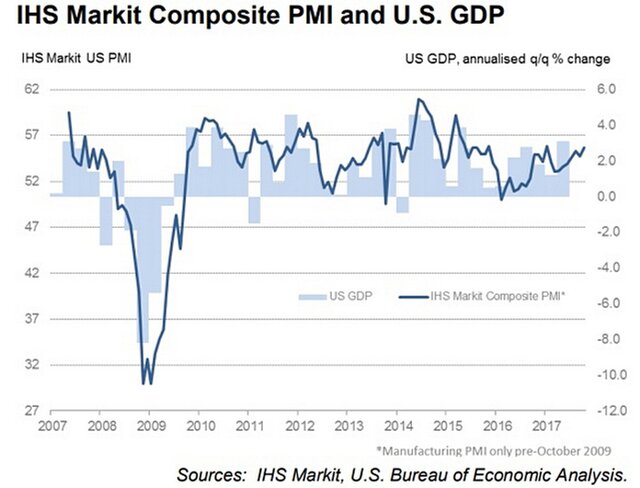 "Экономика США продемонстрировал сильный старт в последнем квартале 2017 года. Устойчивый рост сектора услуг и обнадеживающий отскок в производственном секторе в совокупности привели в октябре к одному из самых резких подъемов в частном секторе за два с половиной года", - сообщил заместитель директора IHS Markit Тим Мур.