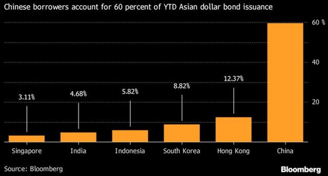 По данным Bloomberg, в этом году на долю эмитентов из Китая приходится около 60% облигаций, номинированных в долларах США, в Азии за пределами Японии. Продажи будут расти, пока не начнут соответствовать доминирующему статусу Китая на региональных рынках акций и ВВП, сказал Салман Нияз, исполнительный директор по рынку облигаций развивающихся стран в Goldman Sachs Asset Management.