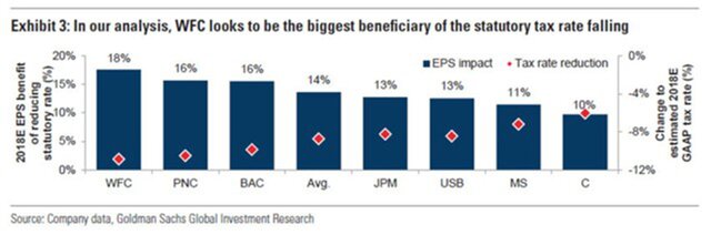 Goldman Sacks опубликовал аналитический материал, где отмечает, что налоговая реформа, по их расчетам, повышает доходы банков в расчете на одну акцию примерно на 13%.