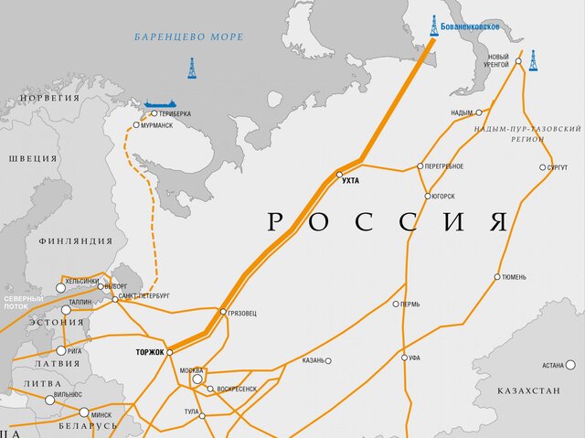 Для подачи 55 млрд куб. м газа в год в "Северный поток 2" необходимо расширить северный коридор Единой системы газоснабжения от полуострова Ямал до южного берега Финского залива. "Газпром" построит новые мощности от Бованенково, а именно газопроводы "Бованенково-Ухта 2", "Ухта-Торжок 2" и "Починки-Грязовец".