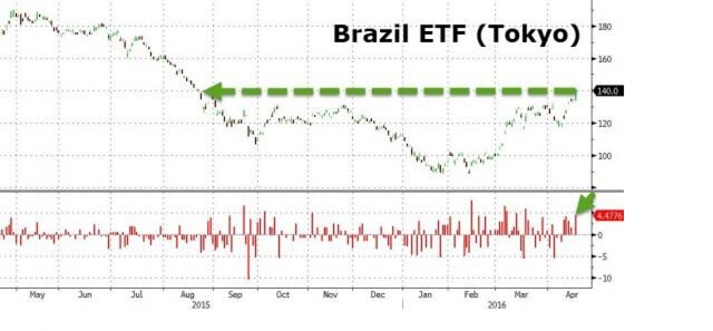 В ходе торгов в Токио биржевой фонд ETF, инвестирующий в бразильские акции, взлетел в цене сразу на 4,5%.