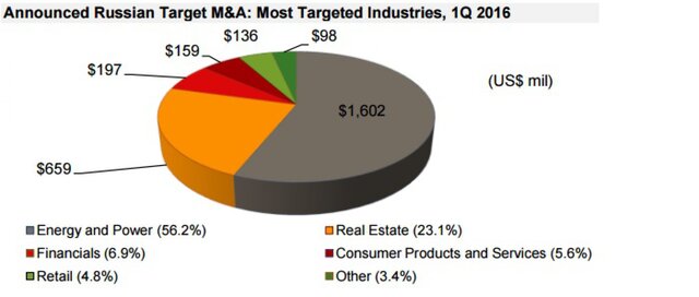 Данный показатель составляет 56% от общего объема сделок слияния и поглощения за I квартал 2016 г. с участием российских компаний.