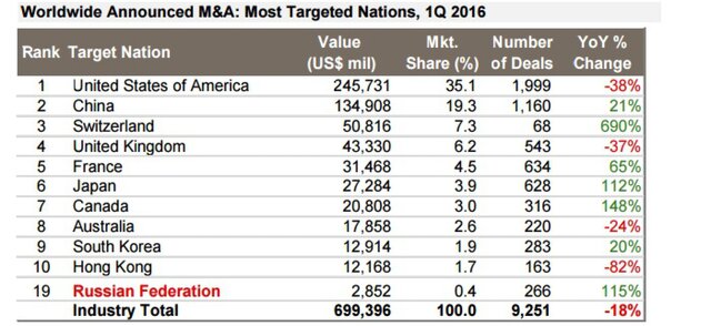 Объем заявленных сделок в области слияний и поглощений с участием российских активов достиг $2,9 млрд за I квартал 2016 г. Это вдвое больше по сравнению с тем же периодом прошлого года, по оценкам экспертов Thomson Reuters.Объем заявленных сделок в области слияний и поглощений с участием российских активов достиг $2,9 млрд за I квартал 2016 г. Это вдвое больше по сравнению с тем же периодом прошлого года и занимает 19-е место в мировом рейтинге, в котором лидирует США с $245,7 млрд, по оценкам экспертов Thomson Reuters и Freeman Consulting.