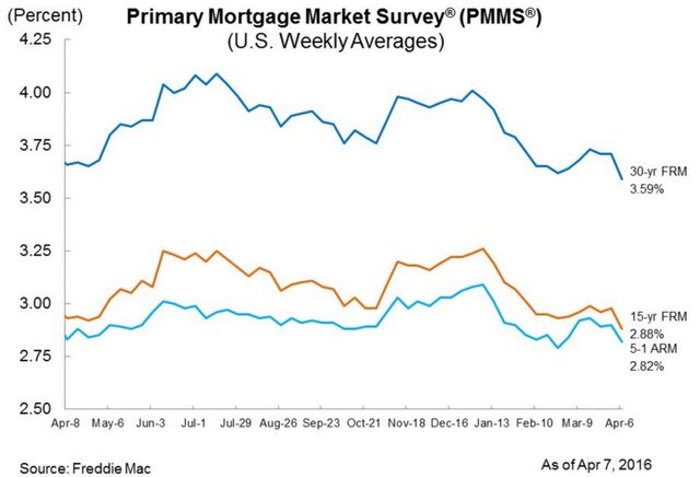Средняя фиксированная процентная ставка по 30-летней ипотеке за неделю по 7 апреля упала до 3,59% годовых с 3,71% неделей ранее. 15-летние кредиты теперь предоставляются под 2,88% по сравнению с 2,98% неделей ранее.