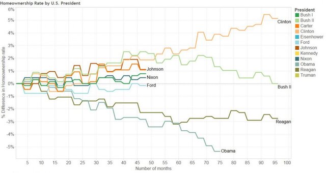 Стоит отметить, что экономика 44-го президента США Барака Обамы по уровню частного домовладения (63,7%) еще в 2015 г. вернулась в эпоху 36-го президента США Линдона Джонсона.