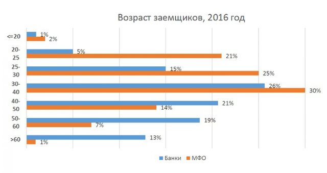 Оценивались возрастные группы клиентов, которые обращались в банки и в онлайн-МФО, начиная с первой половины 2014 г.