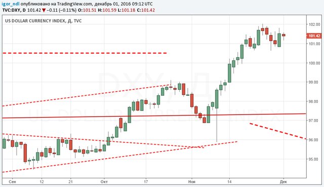 Скорее всего, участники рынка будут после заседания ФРС отыгрывать будущие ожидания, а здесь все будет зависеть от прогнозов членов Комитета по операциям на открытом рынке. Если они, как и год назад, пообещают несколько повышений ставки в следующем году, то курс доллара с высокой долей вероятности продолжит свой рост, как, впрочем, и доходности по казначейским облигациям.