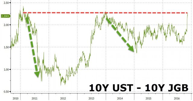Спред между Treasuries и японскими гособлигациями достиг максимума за шесть лет.