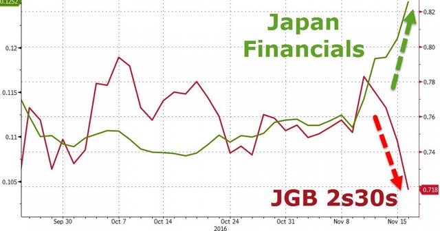 При этом кривая доходности гособлигаций Японии сглаживается, что противоречит целям регулятора (несмотря на то, что акции банков резко выросли после победы Дональда Трампа на президентских выборах в США).