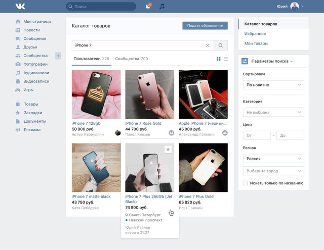 В разделе "Товары" пользователю в первую очередь отображаются объявления его друзей и друзей друзей. Кроме того, доступен поиск по объявлениям всех пользователей и сообществ ВКонтакте. Покупатель может искать по наименованию и описанию товара, уточнять категорию, цену и регион.