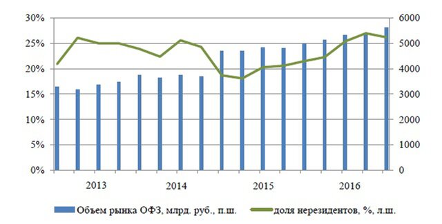 Динамика рынка ОФЗ России и доли нерезидентов (2013–2016)