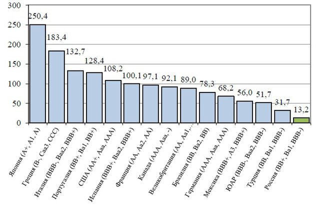 Рейтинговые агентства также, вопреки своей практике, не отражают в своих оценках гособлигаций России низкое соотношение госдолга России к ВВП.