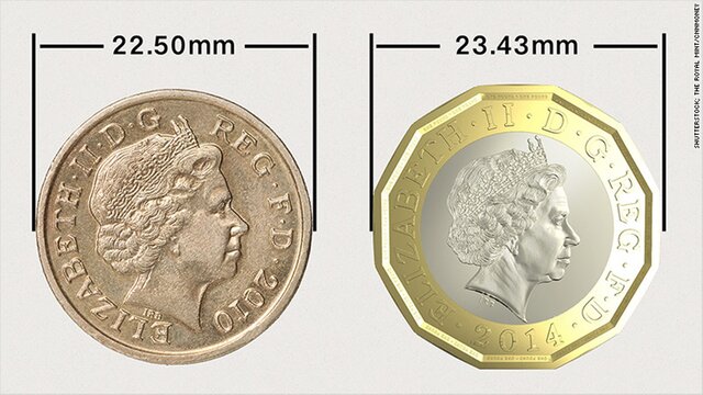 Новая монета изготовлена ∎∎из двух металлов: наружного кольца из никель-латуни и внутреннего кольца из никелированного сплава. Старые монеты перестанут принимать для платежей в октябре. Но банки будут продолжать принимать их после этого.