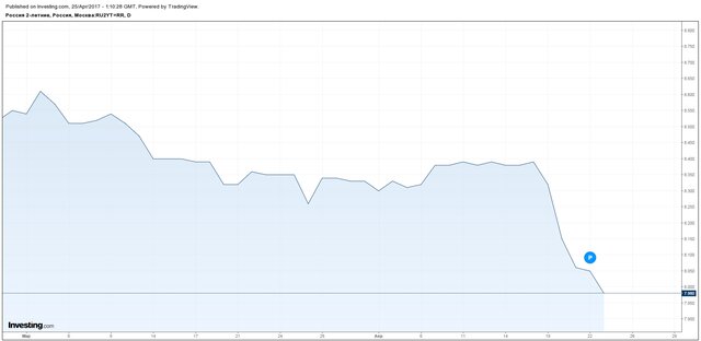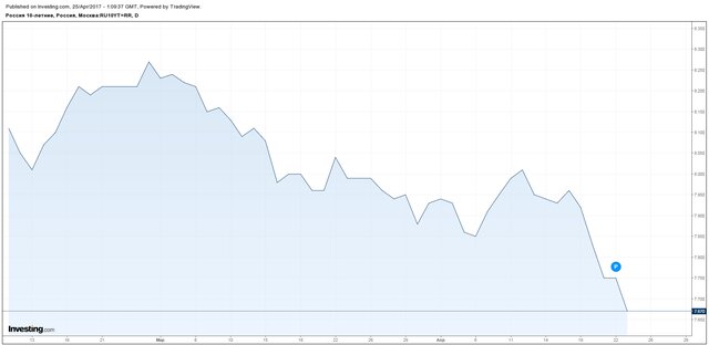 Доходность десятилетних ОФЗ опустилась сейчас ниже 7,7%, хотя еще на прошлой неделе они торговались с доходностью около 8%.