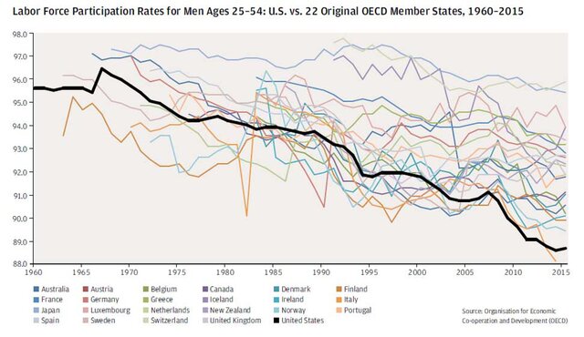 Однако, если изучить данные более тесно и сосредоточиться на одном ключевом сегменте – на мужчинах в возрасте 25-54 лет – можно увидеть, что с 1968 года их доля составляла 96%. Сейчас – чуть более 88%.