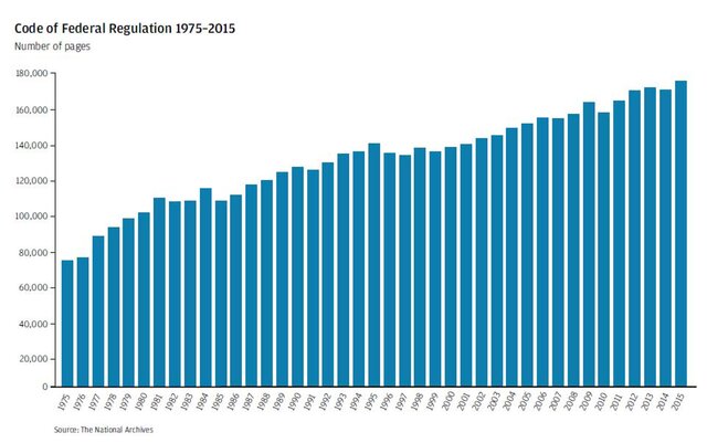 Да, необходимо надлежащее регулирование - и, да, хорошие правила имеют много положительных эффектов.Но многие в бизнесе понимает пагубные последствия усложненных и неэффективных правил. На этом графике отражено общее количество страниц федеральных нормативных актов.