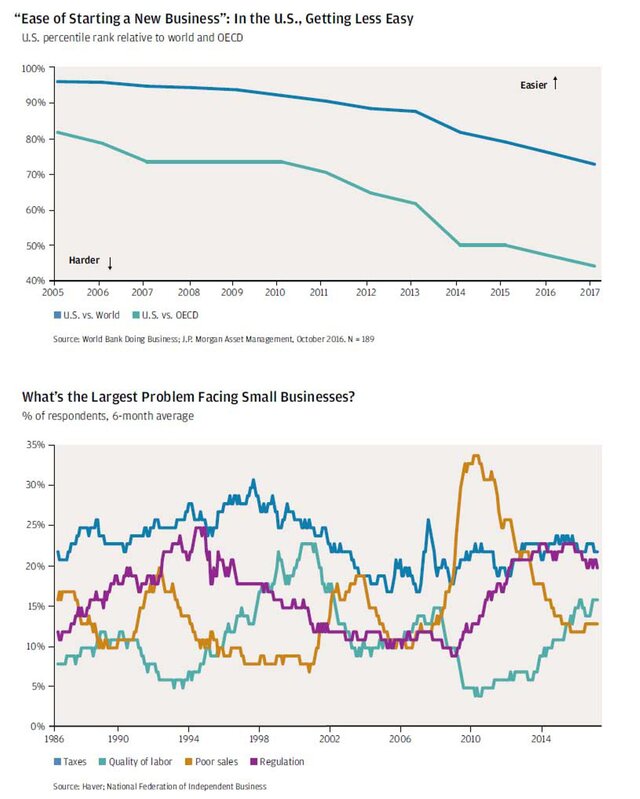 Из второго графика видно, что, если сравнить США с остальными странами в плане легкости открытия нового бизнеса – перевес явно не на стороне США. Нижний график показывает, что малые предприятия сообщают о том, что одна из самых больших проблем для них на сегодня – это именно огромное количество регулятивных норм.
