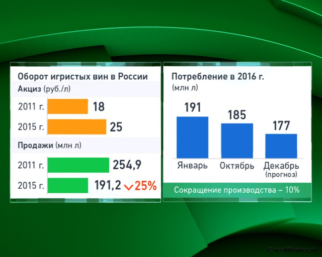 Сегодня акциз на игристые вина составляет 36 руб. на литр, а на "тихие" вина – 18 руб. на литр. Причем акцизы закладываются в цены и оплачиваются потребителями, поясняли эксперты. Но в результате отечественные вина становятся менее конкурентоспособными в сравнении с аналогичной иностранной продукцией.