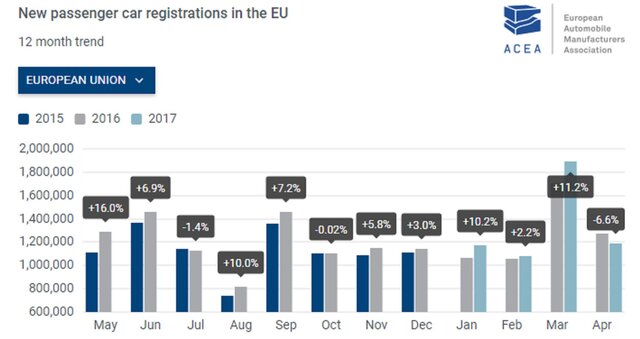 В апреле продажи снизились в ЕС на 6,6% до 1,191 млн единиц, в основном из-за празднования Пасхи, отмечают в АСЕА.