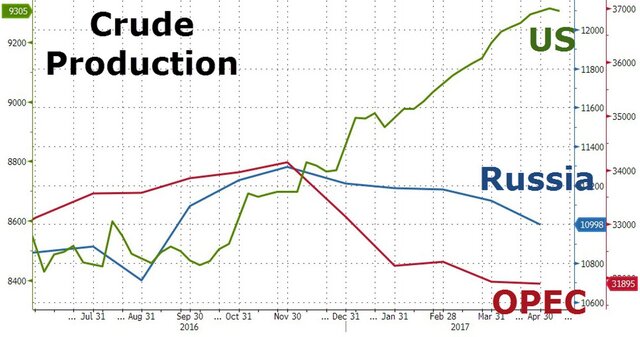 Между тем, производители сланцевой нефти продолжают наращивать объемы добычи, а Goldman Sachs сообщает о стремительном увеличении количества активных буровых установок: за год на 128%. В абсолютном выражении это увеличение составило 404 буровые установки, что позволило увеличить выпуск нефти до 9,3 млн баррелей в день, то есть на 10% больше, чем в середине 2016 г.