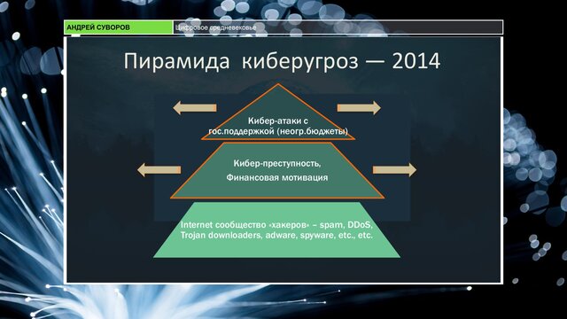 "Сегодня мы с вами живем во времена, когда крупнейшие корпорации мира запускают внутри себя инициативы, которые называются "принеси свое собственное оборудование". Это очень помогает экономить. В крупнейших компаниях порядка 25% оборудования компании не принадлежит. Специальные есть инициативы по тому, чтобы сотрудники приносили свои компьютеры, которые им нравятся. Это, с другой стороны, означает серьезное повышение уязвимости таких корпоративных систем, потому что на этих компьютерах и смартфонах, планшетах используются практически все типы приложений, которые раньше находились внутри компании – финансовые системы, клиентские данные, личные. Приложения корпоративные мы теперь носим с собой, для того чтобы в реальном времени иметь возможность нажать кнопочку "утверждаю" либо что-то посчитать, либо ответить, то есть вот это похоже на то, что собой сегодня представляет предприятие".Усугубляет ситуацию перестановка в "пирамиде" киберугроз с точки зрения исполнителей и ресурсов. В последние несколько лет мы видим, что в рамках одной кампании могут быть использованы силы самых профессиональных и высокооплачиваемых хакеров при финансировании со стороны того или иного государства.