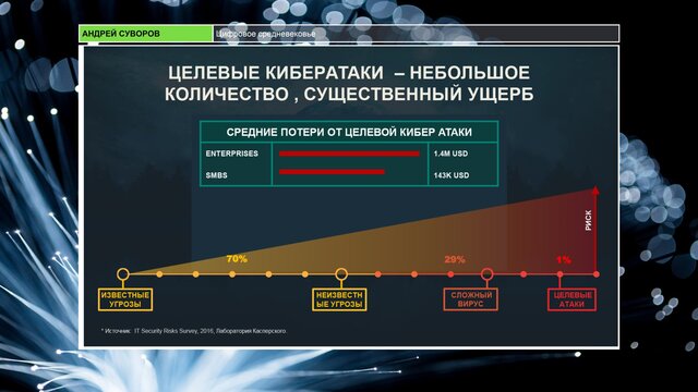 Человечество давно прошло "темные времена", когда помыться удавалось не всегда, нормальных лекарств не было, ведьм сжигали на главной площади, и уровень грамотности опустился до катастрофически низкого уровня. Но в цифровой сфере мы попали в Средневековье. Сколько оно продлится – зависит от нас. О том, как кибербезопасность становится одним из ключевых направлений в бизнесе, и о том, что уже делают российские специалисты, чтобы стать лидерами в этой области, на форуме Vestifinance рассказал Андрей Суворов, директор по развитию направления безопасности критической инфраструктуры "Лаборатории Касперского".