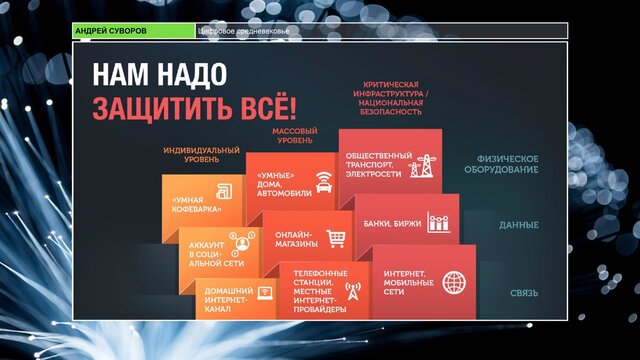 Андрей Суворов утверждает, что необходим комплексный подход: защищать нужно данные, связь, физическое оборудование на индивидуальном, массовом, корпоративном и государственном уровне.