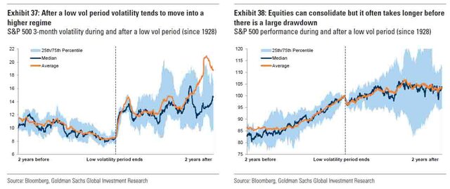 Кристиан Глиссман, стратег Goldman, присоединяется к общей тенденции и пишет, что, хотя "периоды низкой волатильности не должны заканчиваться плачевно, но часто именно так и происходит".