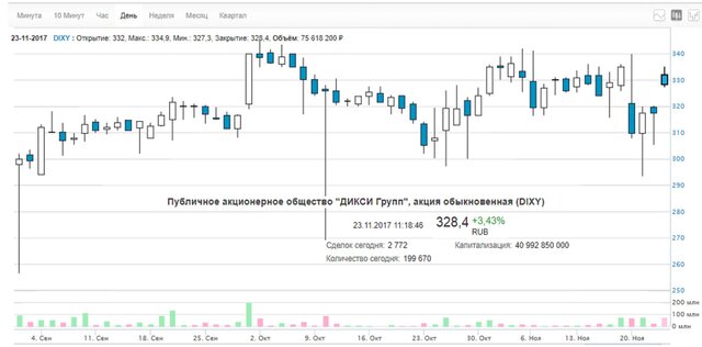 Компания объявила цену выкупа по 340 руб. за акцию, что оказалось выше рынка. В итоге за первый час торгов Мосбиржи акции "Дикси" выросли на 3,5% до 328,5 руб., а в первые минуты торгов рост достигал 5%.