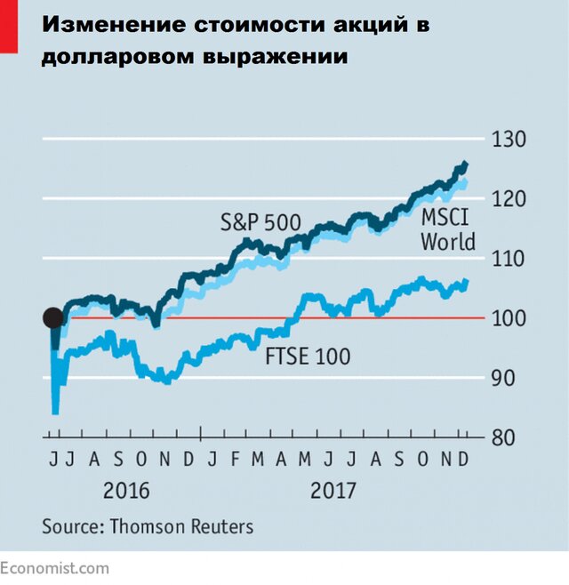 В относительном выражении британские акции имеют не очень хорошие показатели. При оценке в долларах FTSE 100 вырос всего на 6% за время после референдума, по сравнению с 23% у MSCI World Index и 26% у S&P 500. Как в долларовом, так и в стерлинговом выражении FTSE 100 демонстрирует наихудший результат среди развитых стран в 2017 г.