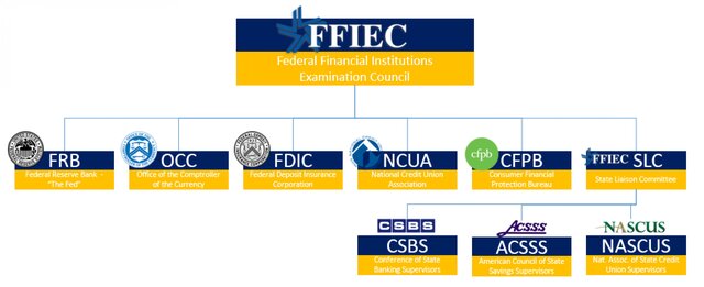В состав FFIEC входят представители Федеральной корпорации страхования депозитов (FDIC), руководства ФРС, Национального управления кредитных союзов, Управления контролера денежного обращения, Управления по надзору за сберегательными учреждениями США и ряд других организаций.