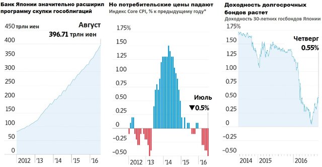 Банк Японии в течение трех с половиной лет использует радикальные меры, чтобы поддержать экономику страны. В этом году регулятор к тому же ввел отрицательные процентные ставки, однако рост и инфляция остаются слабыми.