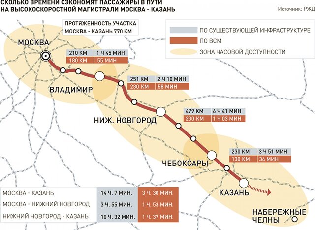 Протяженность ВСМ составит около 770 км, скорость движения поездов - до 400 км/ч, на дороге предусмотрены остановки через каждые 50-70 км. Время в пути от Москвы до Казани составит 3,5 ч против нынешних 14 ч.