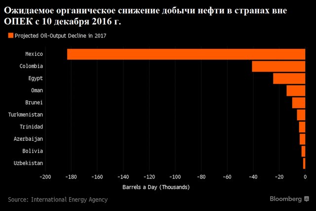 Пока мы видим, что группа нефтедобывающих стран может обеспечить только 80% обещанных сокращений. Хотя Россия пообещала также сократить добычу на 300 тыс. баррелей в сутки в первой половине 2017 г., другие производители, не входящие в ОПЕК, такие как Мексика, Азербайджан и Колумбия, столкнулся с непроизвольным спадом добычи, который уже учтен в ценах и прогнозах.