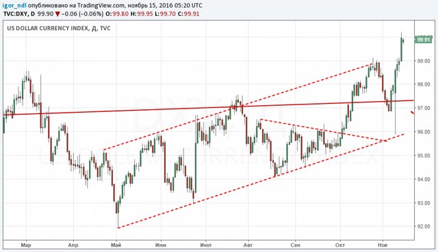 Ну а тем временем индекс доллара к корзине шести основных валют протестировал отметку 100 пунктов. Теперь, если удастся закрепиться на этих уровнях, мы вправе ожидать дальнейшего роста.