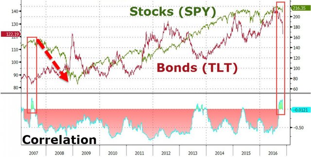 В последний раз, когда стоимость облигации была настолько "дешевой" относительно акций, доходности десятилетних трежерис рухнули на 45 базисных пунктов, а индекс S&P обвалился на 13%. Кроме того, когда корреляция между акциями и облигациями схлопывалась, на рынках начинался обвал.