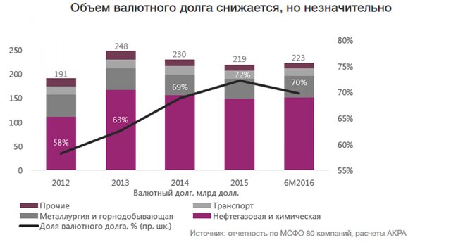 По состоянию на 30 июня 2016 г. около 70% долга компаний, попавших в выборку, было сформировано валютными заимствованиями.