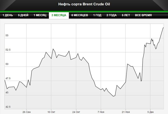 Цена январского фьючерса на нефть WTI на Нью-йоркской товарной бирже к этому времени выросла на 5,3%, составив $54,21 за баррель. Ранее в ходе торгов она достигала до $54,51 - внутридневного максимума с 5 июля 2015 года.