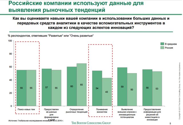 Партнёр BCG и соавтор отчёта Майкл Рингел отмечает: "Мы видим, что новаторы всё чаще используют передовые средства аналитики для поиска ключевых технологий, на которые они приобретают лицензии, и объектов для поглощения и заключения партнёрств, что позволяет им сократить циклы разработок и обойти конкурентов".