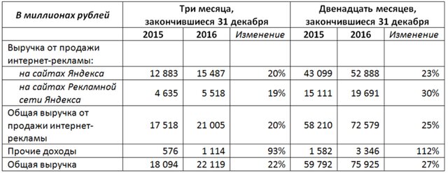 Выручка Яндекса в 2016 г. выросла на 27% до 75,9 млрд руб. В четвертом квартале доходы поисковика увеличились по сравнению с тем же периодом 2015 г. на 22%. Скорректированный показатель EBITDA вырос на 25% до 26,1 млрд руб.